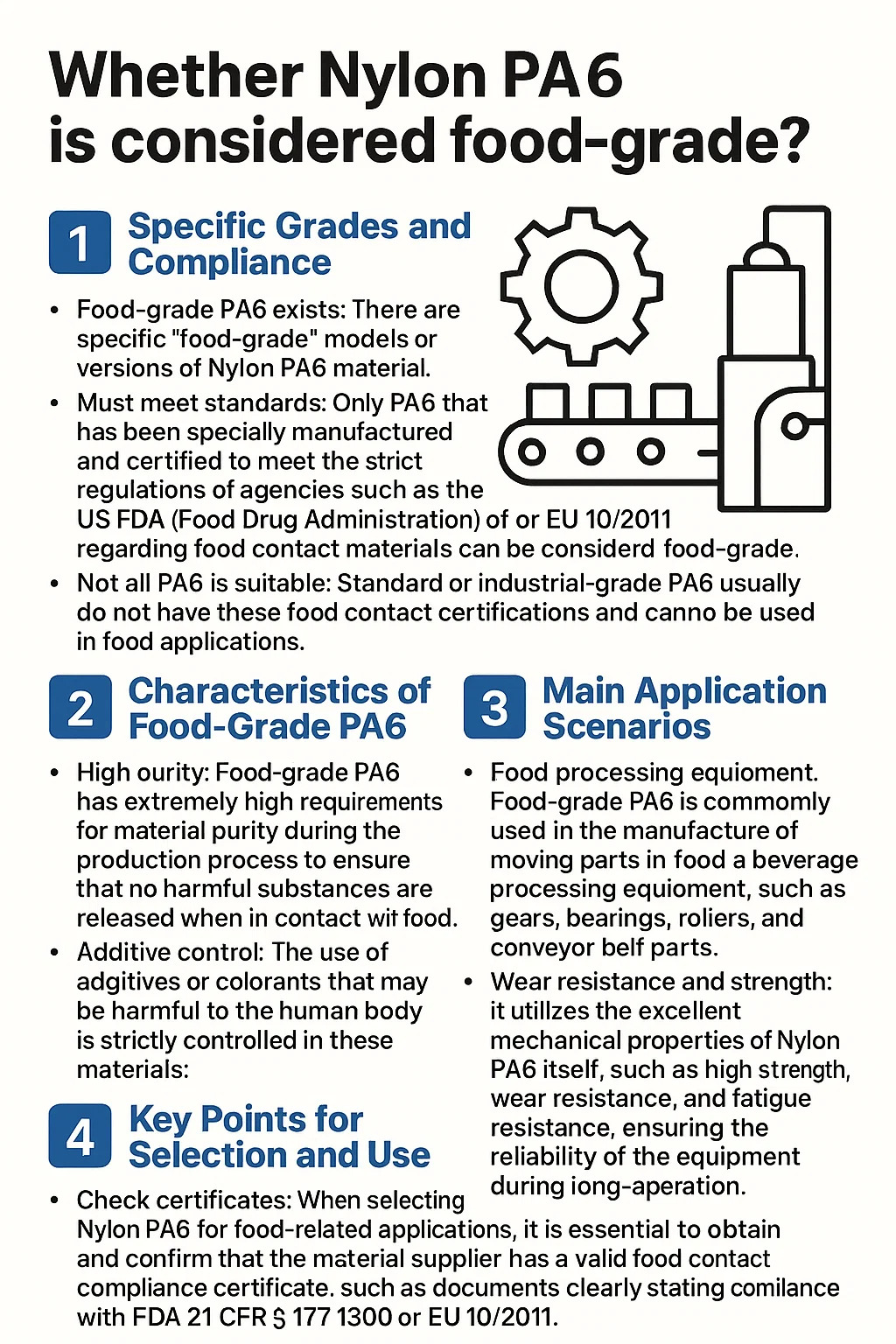 Nije svaki PA6 prikladan: standardni ili industrijski PA6 obično nema te certifikate za kontakt s hranom i ne može se koristiti u primjeni s hranom.