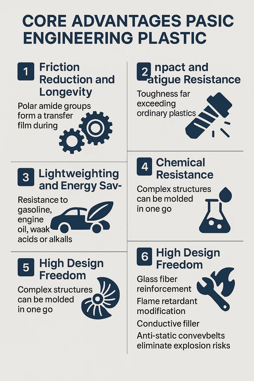 Molekularni lanac sadrži skupine polarnih amida, koje tvore transferni film tijekom trenja, omogućujući da zupčanici i ležajevi rade duže razdoblje bez potrebe za vanjskom mašću. U usporedbi s metalnim komponentama prijenosa, buka se smanjuje za preko 30%, a životni vijek produžen je za pet puta.