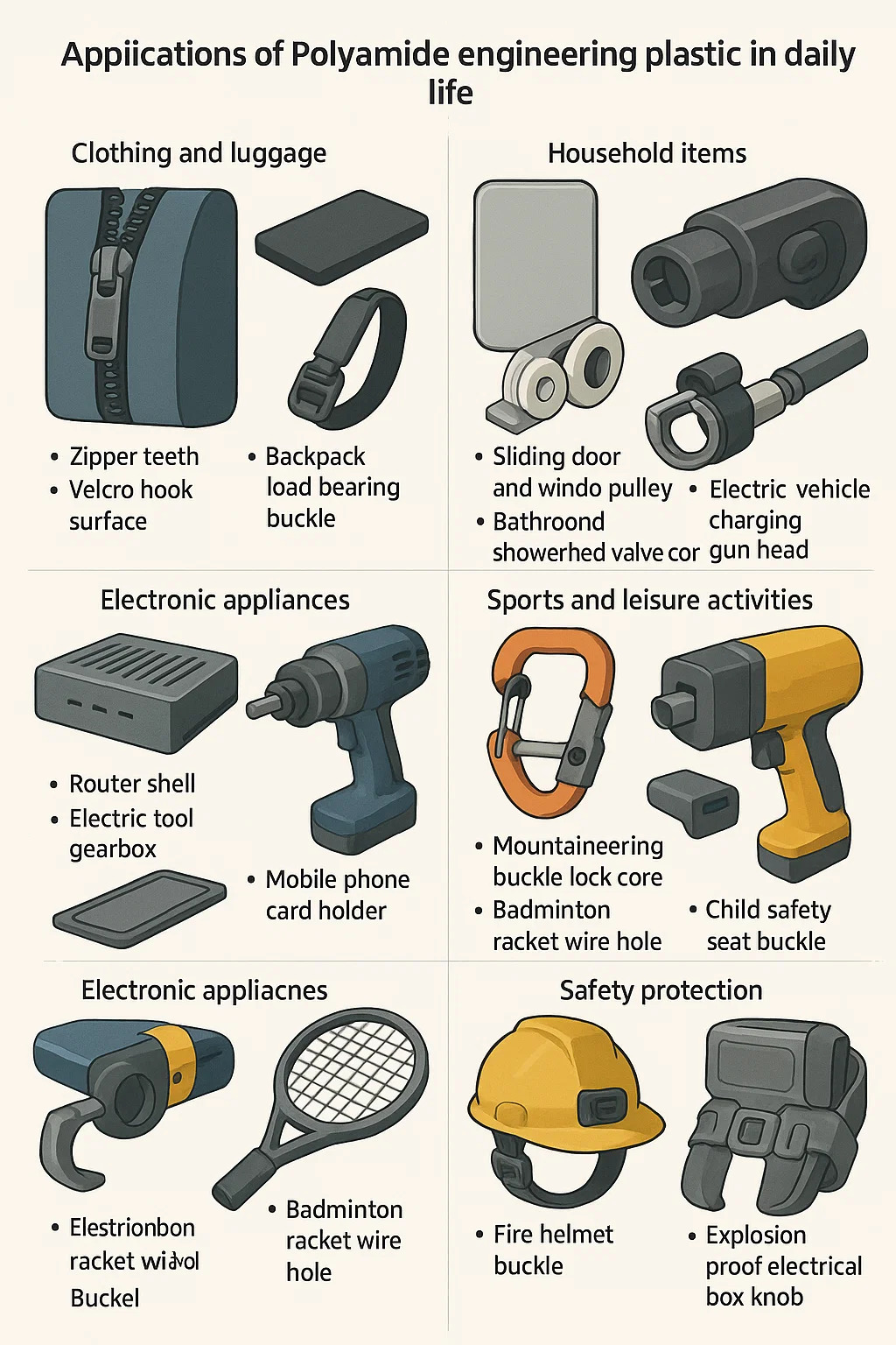 Primjena inženjerski plastični poliamid U svakodnevnom životu prožima više polja, a njegova osnovna vrijednost leži u karakteristikama zamjene čelika plastikom i laganim i izdržljivim. Specifični tipični scenariji su sljedeći: