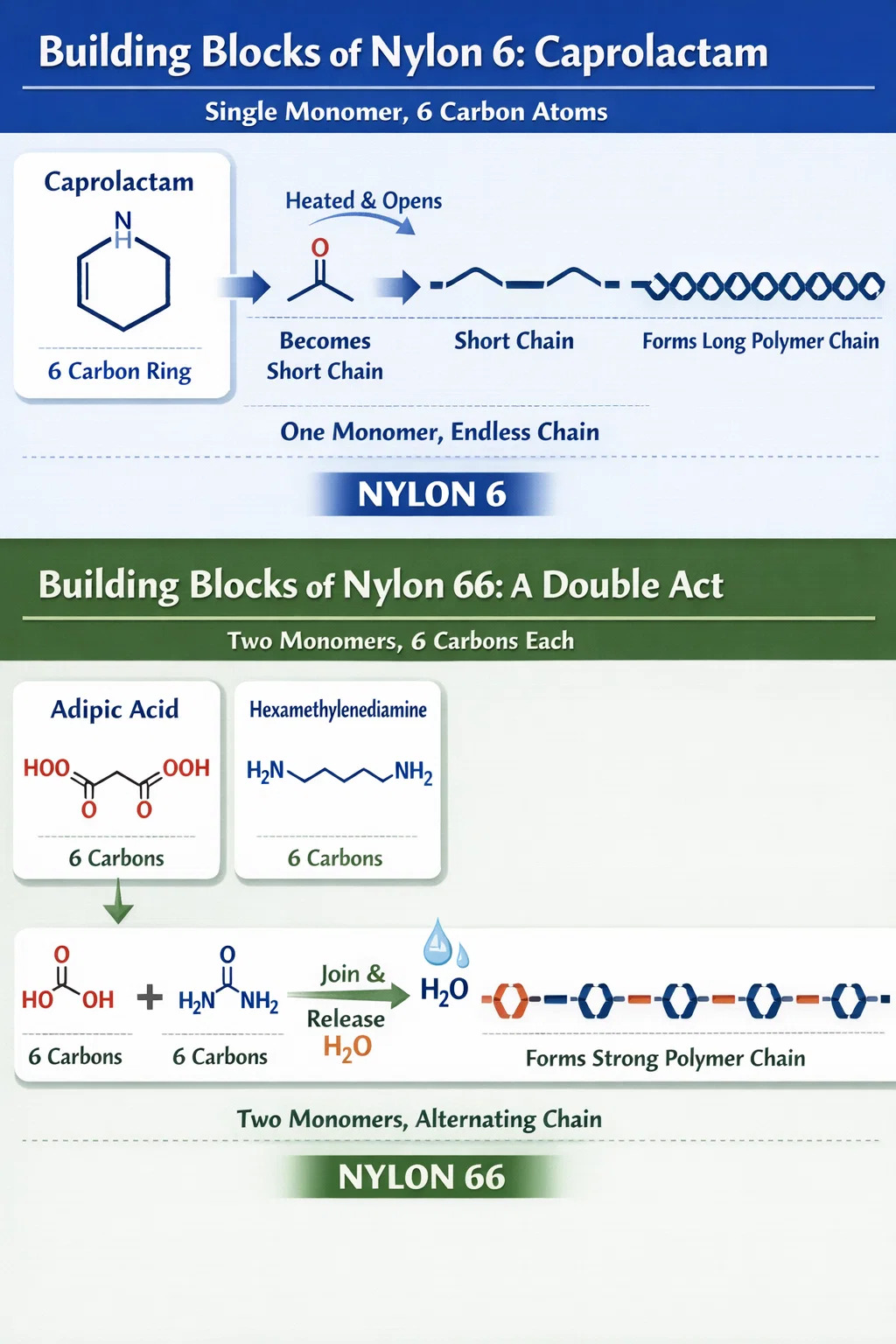 Nylon 66 je kao duet; zahtijeva dva različita građevna bloka za naizmjenično povezivanje.