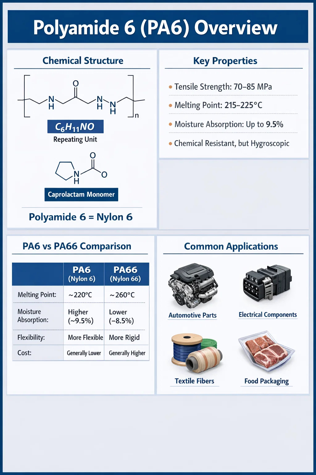 Globalno, poliamid 6 je jedan od najpotrošnijih inženjerskih termoplasta. Godišnji obujam proizvodnje premašuje 4 milijuna metričkih tona , a materijal je sastavni dio industrije u rasponu od automobilske i elektroničke do tekstila i pakiranja hrane. Razumijevanje onoga što znači PA6 samo je početna točka — njegova kemija, karakteristike performansi i ponašanje obrade definiraju zašto je postao tako komercijalno dominantan.